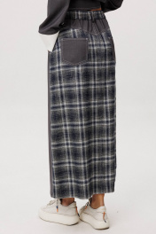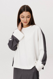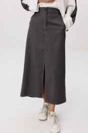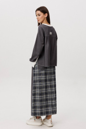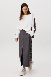 Свободный и стильный костюм для повседневного образа. Невероятный комбинированный свитшот, в котором полочка и часть рукава из мягкого вискозного трикотажа, а спинка из однотонного текстильного полотна. Силуэт-свободный, покрой-рубашечный, круглая горловина с обтачкой, спинка с отрезной кокеткой и мягкими складками. По боковым швам-разрезы. Юбка А-силуэта, на притачном поясе со шлевками, эластичном в области спинки, с перемещенным боковым швом в сторону полочки, наклонным боковым карманом, центральным швом с застежкой и разрезом. Переднее полотнище юбки-из однотонного полотна, заднее-из принтованного. На задних половинках юбки-отрезные кокетки и накладные карманы из отделочного полотна. Длина свитшота около 60см. Длина рукава с плечом около 76 см. Длина юбки около 88 см.