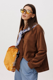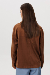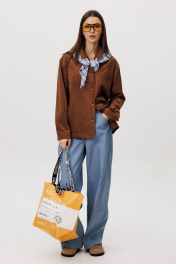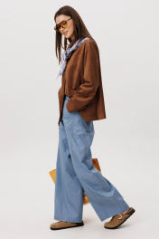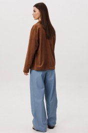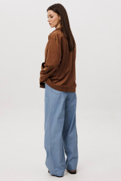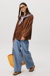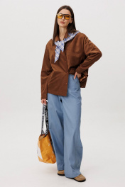 Стильный женский брючный костюм в стиле смарт-кэжуал сочетает комфорт и элегантность. Рубашка выполнена из замшевой ткани, брюки из джинсовой ткани тиффани. Идеальный выбор для повседневных образов. Рубашка: Свободный прямой силуэт, комфортная посадка. Материал под замшу в насыщенном коричневом оттенке. Классический отложной воротник. Застежка на кнопки. Практичные боковые карманы. Брюки ""baggy"" из денима, с интересным худящим эффектом, достигаемым за счет отрезной боковой части, смещенной на передних и задних половинках. Джинсы на отрезном поясе со шлевками, с фигурными карманами по передним половинкам. Задние половинки брюк с отрезной кокеткой и накладными карманами. Боковая часть брюк с отделочными вытачками, придающими легкий объем в области голени. Длина брюк около 106см.
