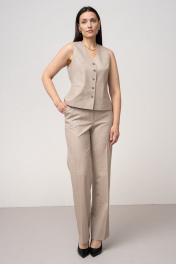 Изящный V-образный вырез и приталенная талия делают силуэт женственным и аккуратным, подчеркивая индивидуальность и деловую уверенность. Жилет застегивается на аккуратную ряд пуговиц спереди, позволяя создать как строгий деловой образ, так и более расслабленный стиль в сочетании с женственными аксессуарами. Этот предмет прекрасно сочетается с классическими брюками или юбками и может носиться как самостоятельная деталь или часть костюма — создавая образ, достойный делового кабинета или важных встреч. Дополнить образ можно брюками Шр-4116