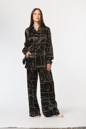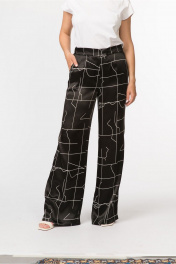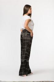 Брюки прямые широкие. Пояс притачной с резинкой по спинке изделия. Карманы наклонные по бокам. Застежка по переду изделия на потайную пуговицу, молнию и крючок. Длина брюк по боковому шву: 108 см. Ширина брюк внизу: 32 см.