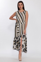Комплектация: платье Силуэт: А-силуэт Тип ткани: вискоза Длина изделия: по среднему шву спинки - 130см Дополнительное описание:изделие без рукавов,отрезное по линии талии, на резинке, с асимметричным воланом и разрезом по низу. В комплект входит пояс из основной ткани.