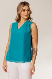Нарядная шифоновая двойная блузка без рукава, с декоративными складками и пуговицами на плечах.