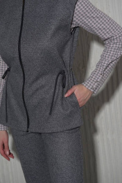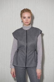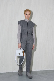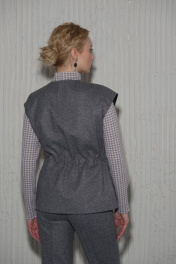 Женский жилет без подкладки полуприлегающего силуэта со шнуровкой на талии. Спереди застегивается на молнию.Плечо немного приспущено. В боковых швах расположены карманы. Данная модель может существовать как самостоятельто так и в комплекте с теплыми брюками 9934.1.32F.