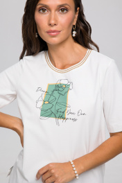 Джемпер-футболка классического фасона, прямого кроя, с коротким рукавом и округлым вырезом-резинкой. Футболка выполнена из мягкого хлопкового полотна средней плотности приятного к телу. Рукава длиной до локтя .Универсальная модель с принтом отлично подойдет для любого образа и станет необходимой вещью в вашем гардеробе. Джемпер будет удобно носить навыпуск или заправлять, отлично сочетается с юбкой, брюками с джинсами, а также можно одеть под пиджак, жакет или кардиган.