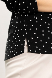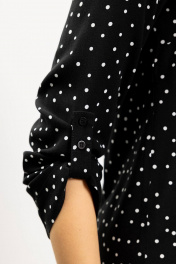 Женская блузка полуприлегающего силуэта с фигурным низом. Длина чуть ниже бедер. Рукав с возможностью регулировки на пату, на которой настрочена декоративная тесьма с петлей и пуговицей .Длина рукава 7/8.Блузка с принтом будет незаменимым элементом вашего базового гардероба.