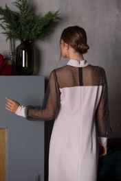 Стильное, элегантное платье прилегающего силуэта , комбинированное из двух полотен. Кокетка и рукав выполнены из прозрачного черного сетчатого полотна в горошек в тон основного полотна, нанесенного в технике "флок". Рукав втачной, длинный на манжете из основного материала шириной 10 - 11см. По спинке - застежка в среднем шве на потайную тесьму - молнию. Воротник - стойка из основного полотна. Платье на подкладке. Двойная выгода от приобретения-и для особого случая, и для офиса и повседневной носки.Параметры манекеншиц: Рост - 174см. Обхват груди - 85см. Обхват талии - 59см. Обхват бедер - 86см. Измерения изделия: Рост - 170см. Обхват груди - 88см. Обхват талии - 67,6см. Обхват бедер - 94см. Длина изделия - 86 см.