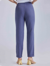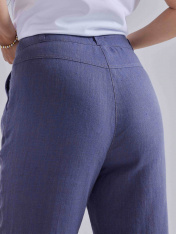 Универсальные женственные льняные брюки зауженного книзу силуэта. Длина брюк 7/8 , которая не только слегка приоткрывает щиколотку, но и добавляет образу элегантности."Индикатор модных тенденций"-манжеты по низу изделия, которые носят не только декоративный характер,но и предохраняют ткань от износа.Для удобства в боковых швах расположены карманы. По линии талии проходит пояс, застежка-молния с петлей и пуговицей. С этой длиной Вы можете продемонстрировать "свою обувную летнюю коллекцию". Выполнены из 100% льна в однотонном синем оттенке.Для тех,кто хочет провести это лето с макимальным комфортом,предназначена эта модель.