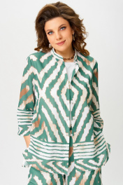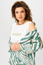 Комплект женский нарядный "Санда" летний для выхода и повседневного образа (блузка, брюки, топ). Блузка прямого силуэта, застежка однобортная, на кнопки, по горловине стойка, по полочке - нагрудная выточка. Спинка в блузке без шва, рукав одношовный 7/8. Низ блузки и рукава обработан швом в подгибку с закрытым срезом. Брюки - прямого силуэта, в боковом шве - карманы, пояс на резинке, низ брюк обработан швом в подгибку, с закрытым срезом. Топ с печатью на полочке, изготовлен топ из трикотажной ткани, полуприлегающего силуэта. По полочке топа - нагрудная выточка, проймы и горловина обработаны планкой, низ изделия обработан на распошивалке.