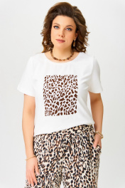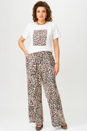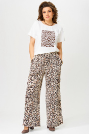Брючный комплект двойка "Таина" состоит из джемпера и брюк. Брюки прямого силуэта. Пояс прямой, на резинке. На передней половинке брюк обработаны карманы «хулиганы». Джемпер прилегающего силуэта. По груди вытачка. Горловина обработана планкой. На полочке печать "Леопард". Рукав втачной одношовный. Низ джемпера и рукава обработан распошивалкой.
