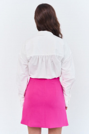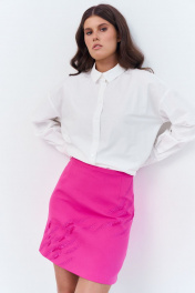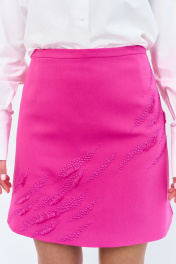 Юбка А-силуэта с вышивкой по переду. Характеристики: выполнена из плательной ткани в цвете розовой фуксии, юбка на подкладке, застежка-молния по заднему полотнищу юбки, верх юбки обработан поясом-обтачкой. Длина юбки 47 см.