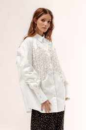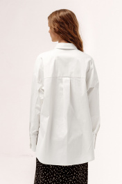 Рубашка оверсайз. Характеристики: свободный силуэт, выполнена из рубашечной ткани в белом цвете, центральная застежка на петли и пуговицы, по полочкам декоративный элемент ввиден настрочных сборенных рюш, по спинке отрезная кокетка и складка, низ рукава обработан манжетой на петли и пуговицы. Длина рубашки по переду 78,5 см, длина рукава 55,5 см.