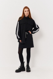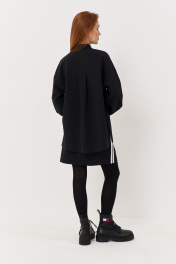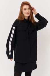 Рубашка свободного силуэта с накладными карманами. Характеристики: свободный силуэт, выполнена из костюмно-плательной ткани черного цвета, по полочкам накладные карманы, центральная потайная застежка на петли и пуговицы, по спинке отрезная кокетка и складка, по рукавам контрастные лампасы, низ рукава обработан манжетой на петли и пуговицы. Длина рубашки по переду 78 см, длина рукава 54 см.