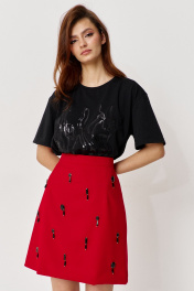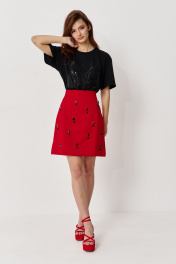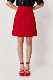 Юбка А-силуэта силуэта. Характеристики: выполнена из костюмно-плательной ткани в красном цвете с декоративными стразами-подвесками, юбка на подкладке, застежка-молния по заднему полотнищу юбки, верх юбки обработан поясом-обтачкой. Длина юбки 50 см.