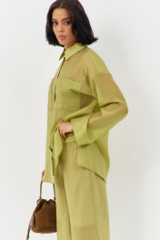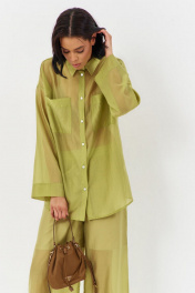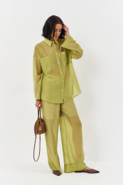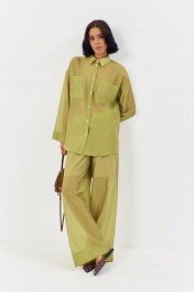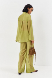 Брюки прямого силуэта на подкладке. Выполнены из блузочной ткани в цвете фисташки. Пояс брюк на резинке с завязками. Длина брюк 112 см.