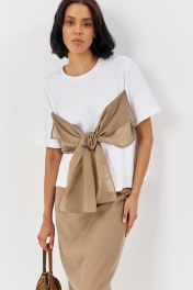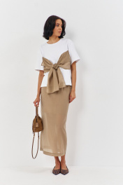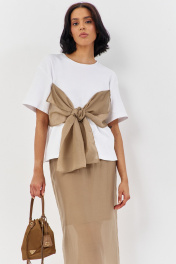 Комплект майка с юбкой. Майка свободного силуэта со спущенным рукавом. Характеристики: выполнена из трикотажного полотна в белом цвете, по переду декоративный бант в цвете капучино, горловина обработана планкой, рукав укороченный. Длина майки по переду 61 см, длина рукава 21 см. Юбка выполнена из блузочной ткани в цвете капучино, пояс обработан эластичной тесьмой (резинкой), по заднему полотнищу юбки обработан разрез. Длина юбки по боковому шву 95 см.