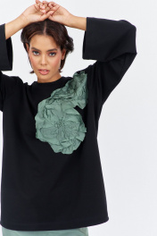 Джемпер свободного силуэта со спущенным рукавом. Характеристики: выполнена из трикотажного полотна в черном цвете, по переду декоративная вышивка, горловина обработана планкой, рукав прямой, спущенный. Длина джемпера по переду 74 см, длина рукава 60 см.