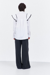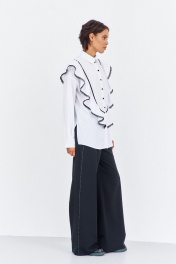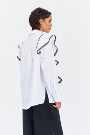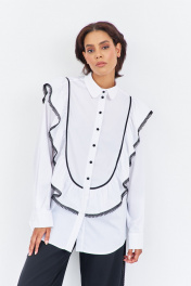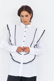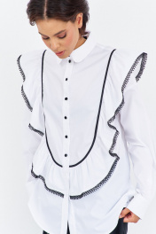 Блузка с рюшами и декоративной тесьмой. Характеристики блузки: выполнена из блузочной ткани в белом цвете, центральная застежка на петли и пуговицы, по переду и спинке декоративные рюши с тесьмой. Длина блузки по переду 80 см, длина рукава+плечо 80 см.