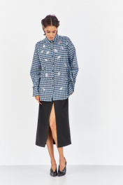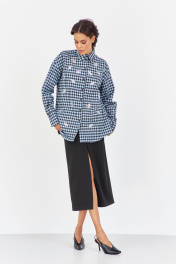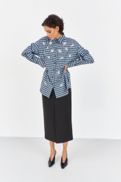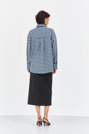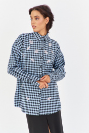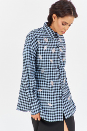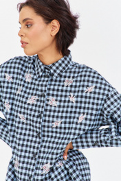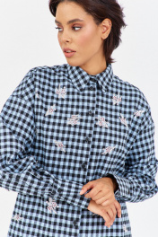 Рубашка в клетку с декоративной вышивкой. Характеристики: свободный силуэт, выполнена из фланелевой рубашечной ткани в черно-голубую клетку, центральная застежка на петли и пуговицы, по спинке отрезная кокетка и складка, по переду декоративная вышивка, низ рукава обработан манжетой на петли и пуговицы. Длина рубашки 80 см, длина рукава+плечо 78 см.