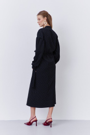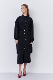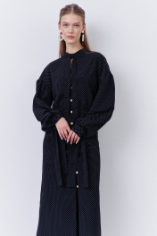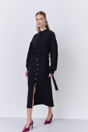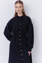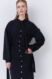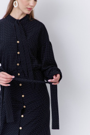 Платье приталенного силуэта с застежкой на петли и пуговицы по переду. Характеристики: выполнено из плательной ткани в принте черный горох, центральная застежка на петли и пуговицы, по талии резинка. Рукава с манжетой по низу. Воротник-стойка на завязку.