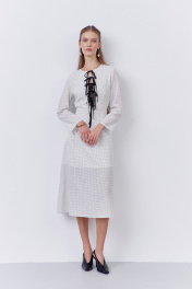 Платье приталенного силуэта с застежкой на петли и пуговицы по переду. Характеристики: выполнено из плательной ткани в принте черный горох, центральная застежка на петли и пуговицы, по талии резинка. Рукава с манжетой по низу. Воротник-стойка на завязку.