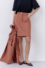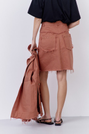 Юбка джинсовая в цвете розовый кирпич с карманами по переду. Верх юбки обработан поясом. По спинке отрезная кокетка и накладные карманы, по которым установлены кнопки.