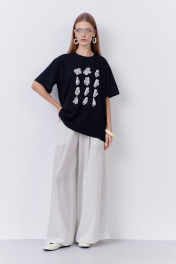 Комплект джемпер с брюками. Джемпер свободного силуэта со спущенным рукавом. Характеристики: выполнена из трикотажного полотна в черном цвете, по переду декоративные цветы из шифона, горловина обработана планкой, рукав укороченный. Брюки-палаццо свободного силуэта. Выполнены из плательной ткани в принте белый горох. Пояс брюк на резинке, в боковых швах карманы.