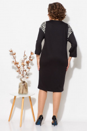 Платье женское прямого силуэта со спущенным плечом, выполнено из трикотажного полотна. Перёд по центру имеет вставку из отделочного трикотажа, а так же отделка имеется и по плечам. Спинка цельнокроеная. Рукав 3/4 с манжетой. Длина платья по спинке - 105 см, длина рукава от плеча - 47 см.