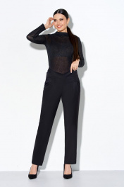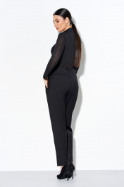 Костюм женский, состоящий из джемпера и брюк. Джемпер прилегающего силуэта из мягкого трикотажного полотна со втачными рукавами, горловина цельнокроенная. Брюки полуприлегающего силуэта, зауженные к низу, притачной декаративный пояс с вырезами по линии талии, в боковых швах карманы, по спинке застежка на потайную молнию.