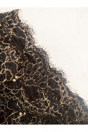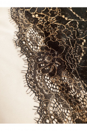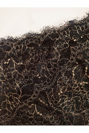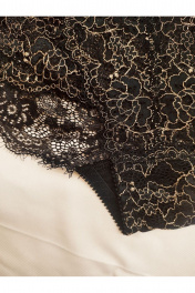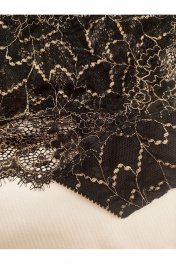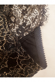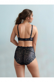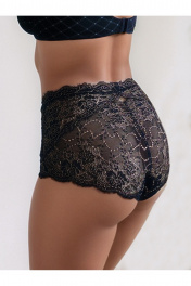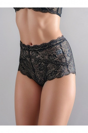 Кружевные трусы высокие больших размеров. Трусы выполнены из эластичного цветочного кружева с золотой вышивкой. Подчеркивают и элегантно облегают фигуру. Комбинация кружевных элементов составляет элегантный рисунок с выемкой на задней части изделия. Верх изделия и ластовица обработаны эластичной резиной. По низу кружевной край без обработки. Хлопковая ластовица.