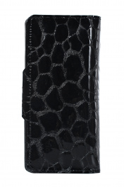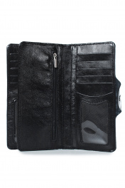 Портмоне закрывается клапаном на кнопку, с украшением на передней части корпуса, с обстрочкой краев, с краями в загибку и в обрезку, с обработкой обрезных краев. Размеры: 90x185x6