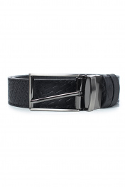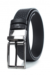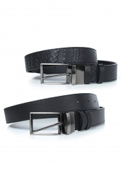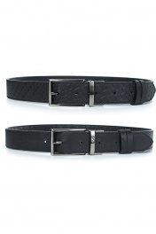 Ремень в обрезку, с обработкой краев, с обстрочкой края, с пряжкой на ремне, с двумя шлевками, двухсторонний. Фурнитура - черный никель. Размеры: 1150x3x33