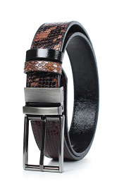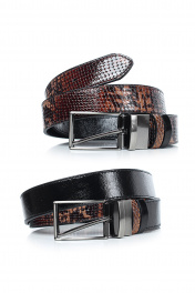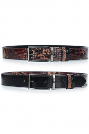 Ремень в обрезку, с обработкой краев, с обстрочкой края, с пряжкой на ремне, с двумя шлевками, двухсторонний. Фурнитура - черный никель. Размеры: 1150x3x33