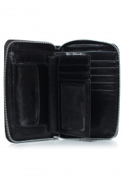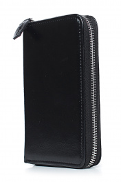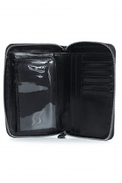 Портмоне на одно отделение, закрывающееся на застежку-молнию, с поводком на движке, с отделением для бумажных купюр, с карманами для пластиковых карт, с отделением для монет. Цвет фурнитуры - никель. Размеры: