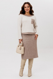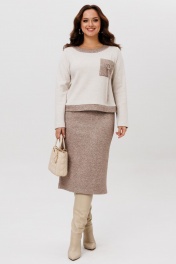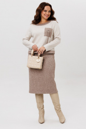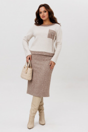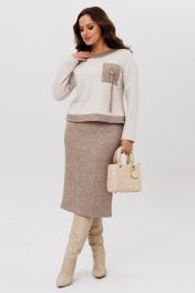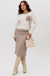 Осенний комплект джемпер и юбка , выполнен из мягкой и приятной к телу трикотажной ткани с добавлением натуральных нитей, которые обеспечивают комфорт и тепло в течение всего дня. Данный юбочный костюм идеально подходит как для офиса, так и для неформального повседневного использования. Джемпер прямого силуэта с вточным длинным рукавом,с планкой из отделочной ткани по горловине и низу изделия. Декором данного комплекта служит накладной карман с дизайнерским элементом. Юбка прямого силуэта, слегка заужена к низу, на подкладке, резинке ,что обеспечивает комфорт при носке. На среднем шве спинки имеется разрез.