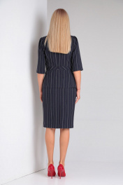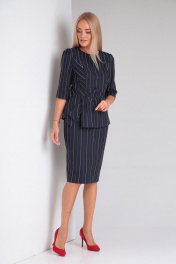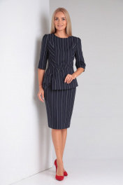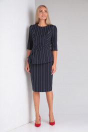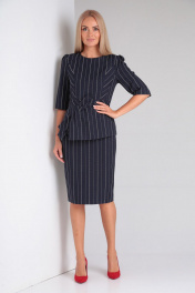 Комплект 2-х предметный. Блузон прилегающего силуэта из вискозной ткани в полоску. Верх лифа с двойными бочками и игрой полоски выигрошно смотрится на фигуре. Бока на подкладке от подреза по талии с ассиметричным низоми декоративным большим бантом, зафиксированом на баске. Спинка также с подрезом и баской. Длиная молния в шве спинки обеспечивает комфортное одевание блузы. Рукав втачной 3/4. Юбка на подкладке, верхний срез на поясе, с частичной резинкой по бокам. Шлица и потайная молния в среднем шве заднего полотнища. Пояс застегивается на петлю-пуговицу. Юбка зауженного к низу силуэта. Длина блузона 59см, длина рукава 39см, длина юбки 64см