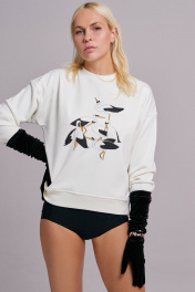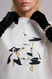 Стильный свитшот из натурального хлопка (95% хлопок) с принтом ""Аист"" станет ярким дополнением вашего образа. Молочный цвет, прямой силуэт, длинный рукав со спущенной линией плеча. Горловина, низ рукава и низ изделия отделаны трикотажной резинкой. По швам плеча, низа рукава, низа изделия проложена двойная декоративная строчка. Такая форма изделия и способ пошива не стесняют движений, обеспечивая дополнительный комфорт при носке, что отмечают наши покупательницы. В комплект к свитшоту идут брюки в цвет, прямого силуэта, зауженные к низу арт.120026. Длина изделия - 42-52,2; 44-53,1; 46-54; 48-55,0см Длина рукава - 42-43,4; 44-44,1; 46-44,8; 48-45,5см. Ширина по линии груди 42-52,5; 44-54,5; 46-56,5; 48-58,5см. Длина плеча: 42-21,4; 44-21,8; 46-23,8; 48-24,6см.