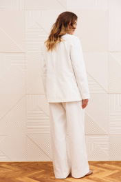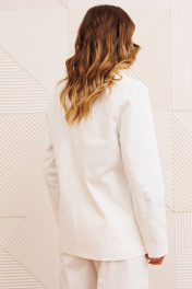 Жакет полуприлегающего силуэта из джинсовой хлопковой ткани с воротником пиджачного типа. Застежка однобортная на две пуговицы. Перед с талиевой вытачкой, рельефом и декоративным клапаном. Спинка с рельефами из проймы и средним швом. Рукав втачной двухшовный. Длина жакета - 68 см, длина рукава жакета - 60 см.