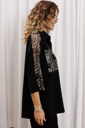 Рубашка свободного силуэта из блузочного крепа. Застежка центральная на петли и пуговицы, воротник на стойке. В боковых швах разрезы. Рукав втачной рубашечного кроя. Карманы спереди и вставка вдоль плеча и рукава выполнеы из кружева. Длина рубашки- 71 см. длина рукава рубашки - 35 см.