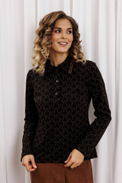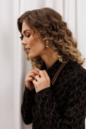 Джемпер прямого силуэта из плотного трикотажного полотна с оригинальным рисунком из люрекса. Перед с застежкой поло и нагрудными вытачками. По воротнику настрочена декоративная тесьма. Длина джемпера - 60 см, длина рукава - 61 см.