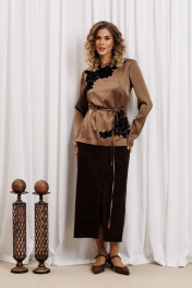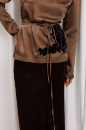 Блузка прямого силуэта выполнена из атласной ткани. Перед с нагрудной вытачкой. Спинка со средним швом и застежкой "капелькой" на петлю и пуговицу сверху. Рукав втачной одношовный. В боковых швах разрезы. По переду настрочена аппликация из велюровых цветов на сетке. К блузке прилагается пояс из основной ткани. Длина блузки - 63 см, длина рукава - 61 см.