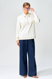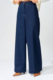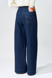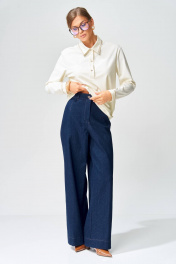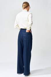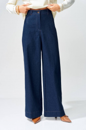 Брюки расширеные книзу на притачном поясе из джинсовой хлопковой ткани. По поясу настрочены шлевки. По передним и задним частям брюк вытачки. На задних частях брюк настрочены карманы. Карманы, вытачки, пояс, низ брюк отделаны отделочной строчкой. Длина брюк с учетом пояса - 109 см. Данная модель прекрасно сочетается с другими моделями из нашей коллекции 15409, 15377, 15408/1, 15368. Создайте гармоничный образ, комбинируя эти изделия!