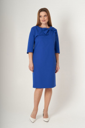 Платье прямого силуэта. Перед с нагрудными вытачками. В верхней части переда отлеткая кокетка переходящая в бант. Спинка с талиевыми вытачками и средним швом. В верхней части среднего шва застежка на потайную молнию. Рукав втачной двухшовный. Длина спинки по среднему шву - 99 см, длина рукава - 40 см.