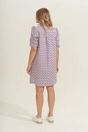 Платье прямого силуэта с центральной застежкой на петли и пуговицы с цельнокроеной планкой и рубашечным воротником с отрезной стойкой. Перед с нагрудными вытачками и настрочным клапаном в районе груди. Спинка с отрезной кокеткой и встречной складкой. Рукав втачной со сборкой по окату. Низ рукава собран на резинку. Низ платья фигурный. Платье дополнено поясом из основной ткани. Фурнитура может быть изменена с сохранением художественного образа. Длина платья - 94 см, длина рукава - 47 см.