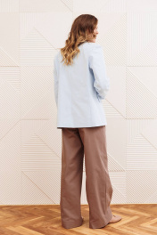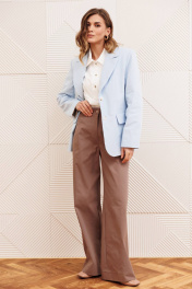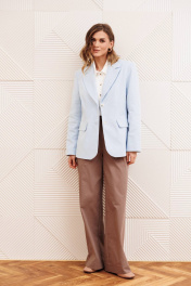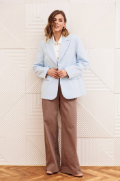 Костюм состоит из жакета и брюк из джинсовой хлопковой ткани. Жакет полуприлегающего силуэта с воротником пиджачного типа. Застежка однобортная на две пуговицы. Перед с талиевой вытачкой, рельефом и декоративным клапаном. Спинка с рельефами из проймы и средним швом. Рукав втачной двухшовный. Брюки расширеные книзу на притачном поясе. По поясу настрочены шлевки. По передним и задним частям брюк вытачки. На задних частях брюк настрочены карманы. Карманы, вытачки, пояс, низ брюк отделаны отделочной строчкой. Длина жакета - 68см, длина рукава жакета - 60 см, длина брюк с учетом пояса -107 см