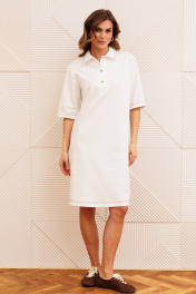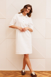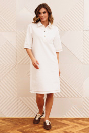 Платье прямого силуэта с воротником поло. Рукав втачной одношовный. По низу изделия, по низу рукава и по воротнику проложена отделочная строчка. Длина платья - 97 см, длина рукава - 30 см