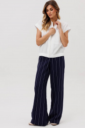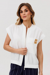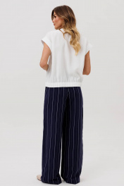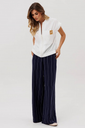 Костюм состоит из жилета (бомбера) и брюк. Жилет (бомбер) свободного силуэта из легкой летней вискоззной ткани. Перед на застежке на молнию, горловина обработана довязом. На левой части переда настрочен карман декорированый нашивкой. Бомбер по низу на резинке. Пройма обработана обтачкой. Брюки палаццо с притачным поясом. Спереди застежка гульфик на молнии и петлей и пуговицей по поясу. По задней частям брюк вытачки. Пояс с резинкой в боковых частях. Брюки с заутюженными стрелками. Длина брюк с учетом пояса - 109 см. Длина жилета (бомбера) - 60 см.