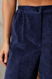 Костюм состоит из джемпера и брюк. Джемпер прямого силуэта с воротником поло из теплого трикотажного полотна. Рукав втачной одношовный. Брюки палаццо с притачным поясом из мягкой вельветовой ткани. Спереди застежка гульфик на молнии и петлей и пуговицей по поясу. По задней частям брюк вытачки. Пояс с резинкой в боковых частях. Брюки с заутюженными стрелками. Длина джемпера- 66 см, длина рукава - 60 см. Длина брюк с учетом пояса - 109 см.