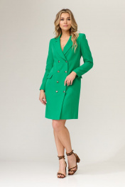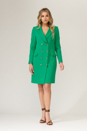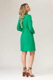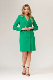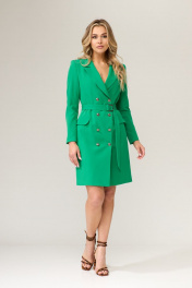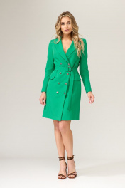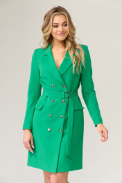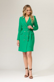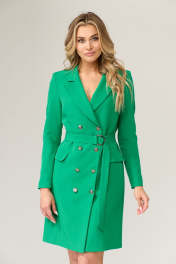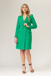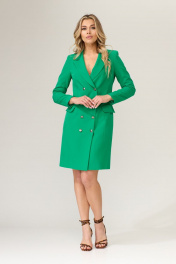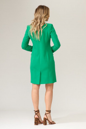 Платье прямого силуэта двубортное на четыре пары петель и пуговиц, с воротником пиджачного типа, с клапанами. Перед с рельефами и нагрудной вытачкой находящейся под лацканом. Спинка со средним швом, рельефами и шлицей. Рукав втачной двухшовный. Платье на подкладке. К платью прилагается пояс из основной ткани с металлической пряжкой.