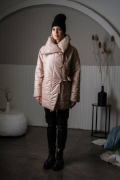 Полупальто двубортное на подкладке из плащевой плотной ткани с наполнителем холлофайбер прямого кроя. По переду рельефы позволяют направить полоски в разных направлениях и оформить застежку из завязок. Также по переду расположены карманы с воздушными клапанами. Рукав втачной двухшовный. Воротник высокий. Длина по спинке р.42-44 - 80см, р. 46-50 - 80см, р.52-56 - 81см, р.58-62 - 81см Длина рукава с плечом р.42-44 - 73см, р. 46-50 - 73см, р.52-56 - 74см, р.58-62 - 74см