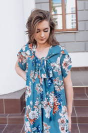 Платье трапециевидное из вискозы. Перед цельнокроеный, воротник - мягкая стойка, идущий на перед в завязывающийся бант. Спинка с талевыми вытачками. Рукав с не большим запахам по окату. Цвет морской волны с принтом. Длина изделия р.42-44 - 102 см, р.46-50 - 103 см, р.52-56 - 104 см Длина рукава р.42-44 - 11 см, р.46-50 - 12 см, р.52-56 - 13 см